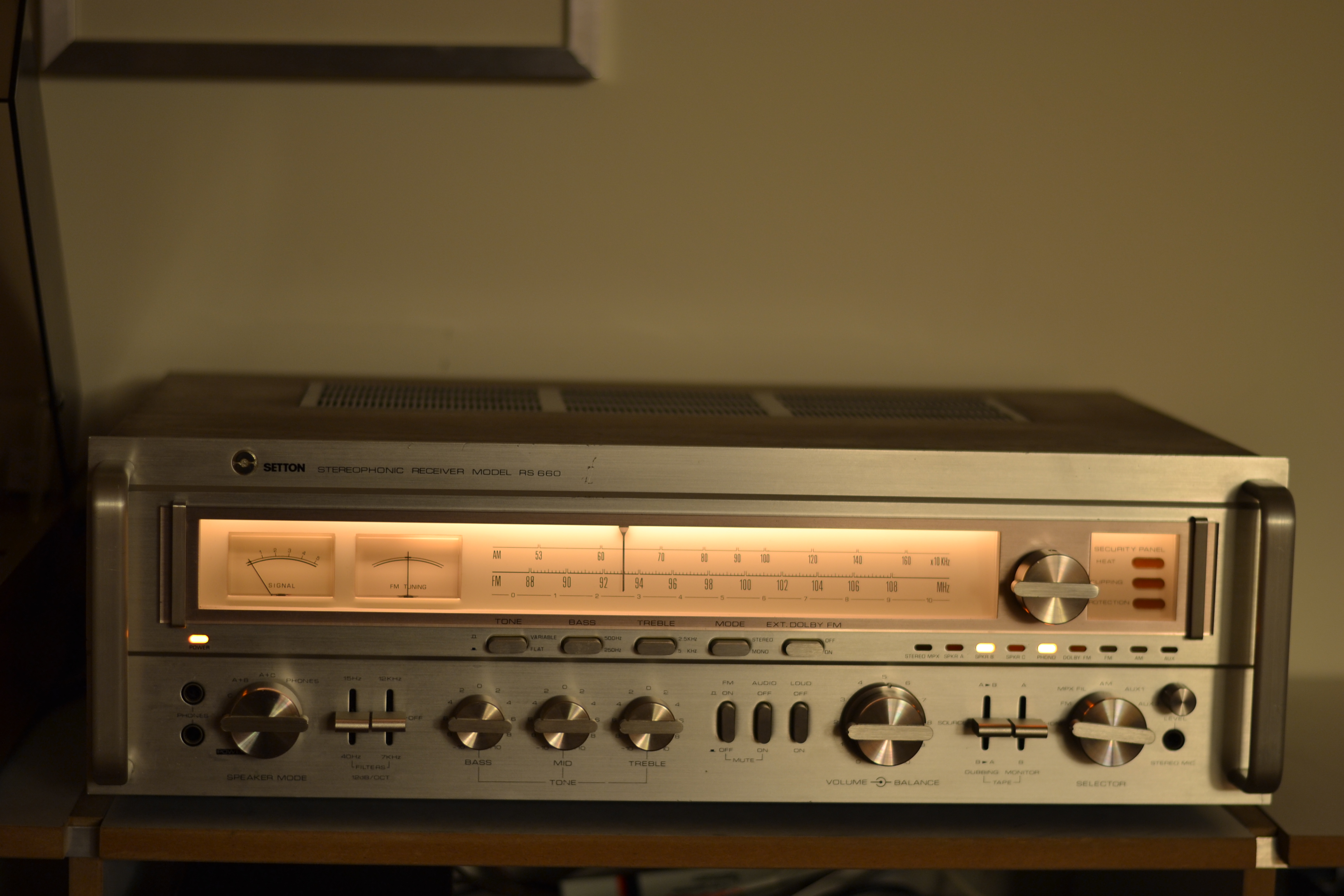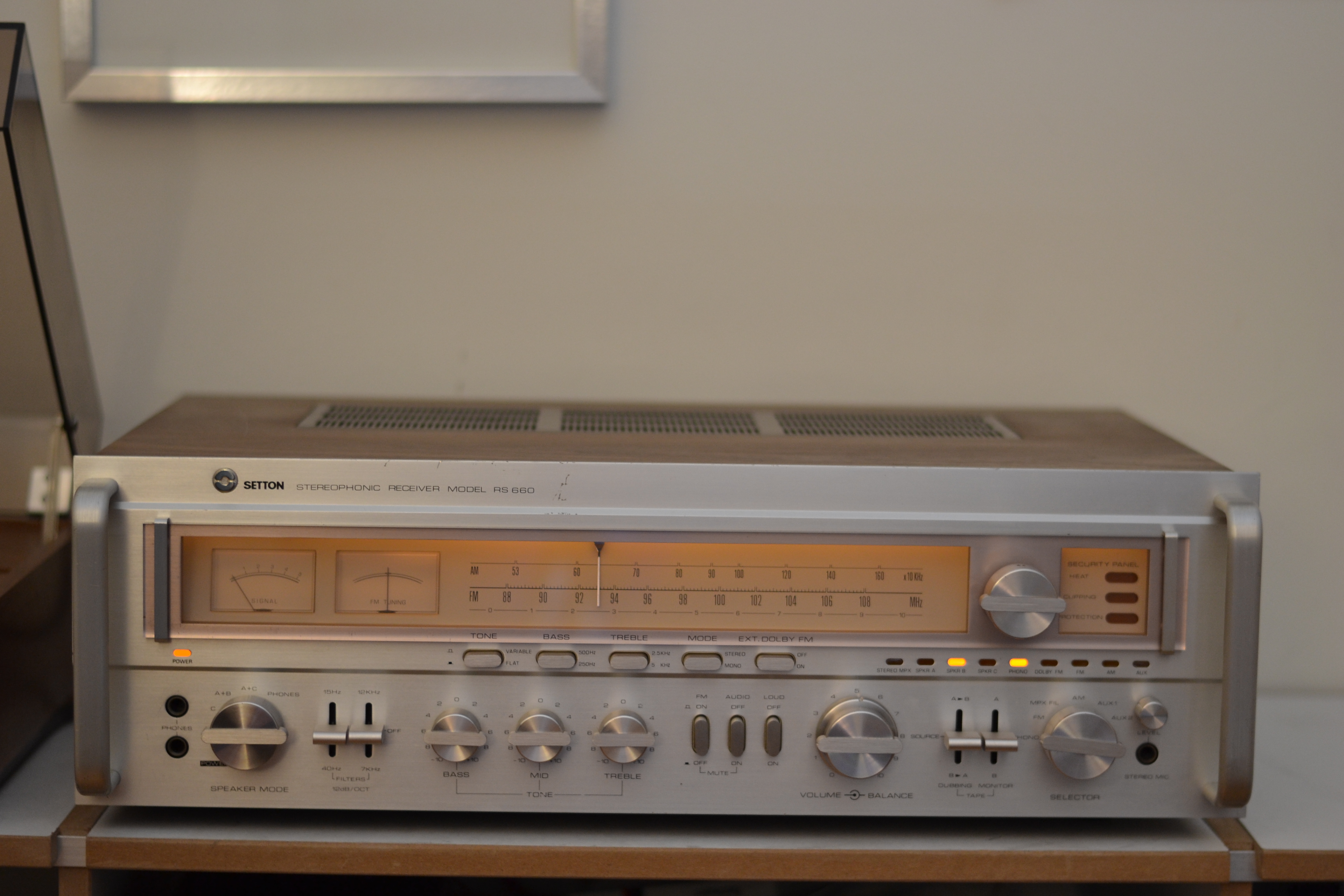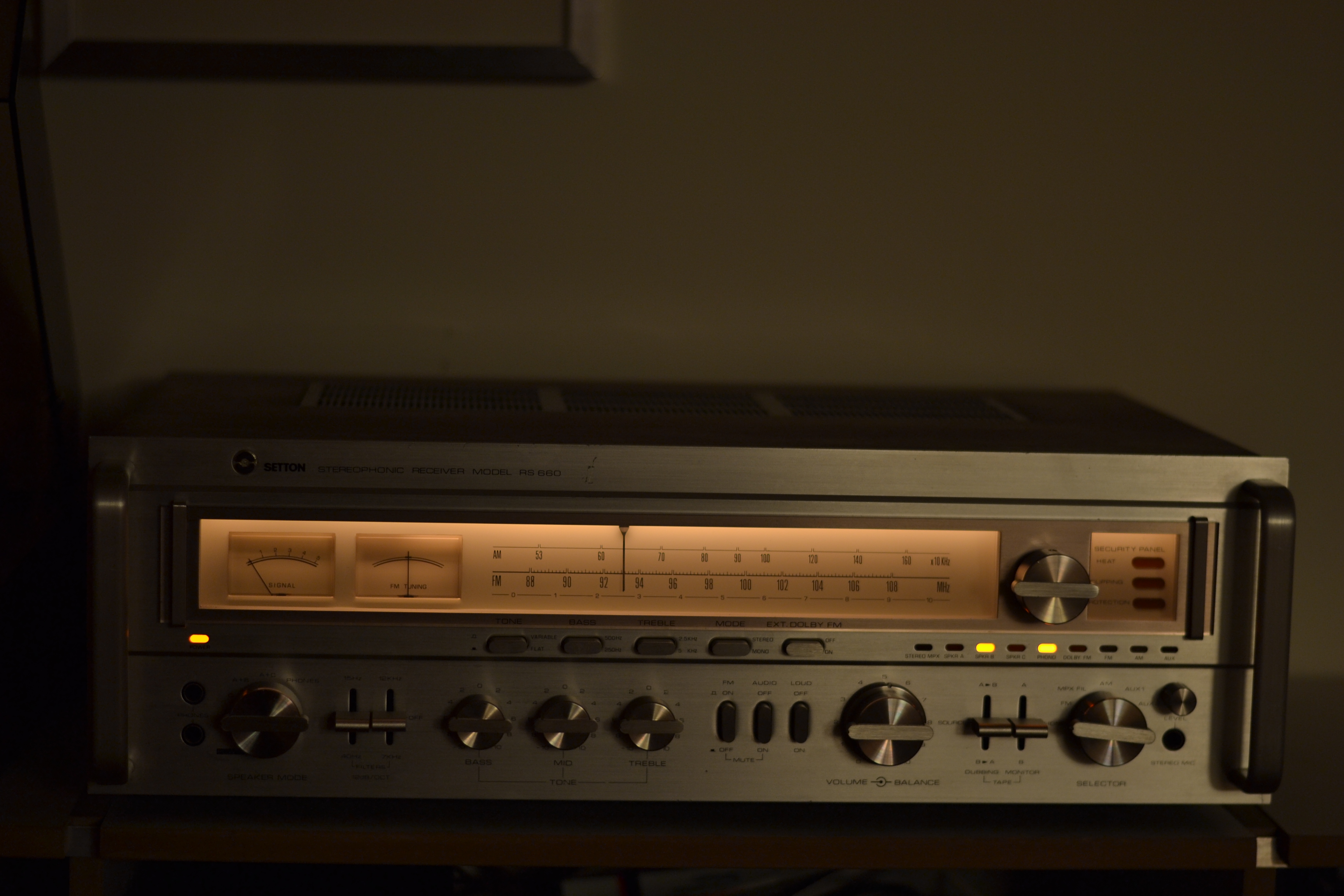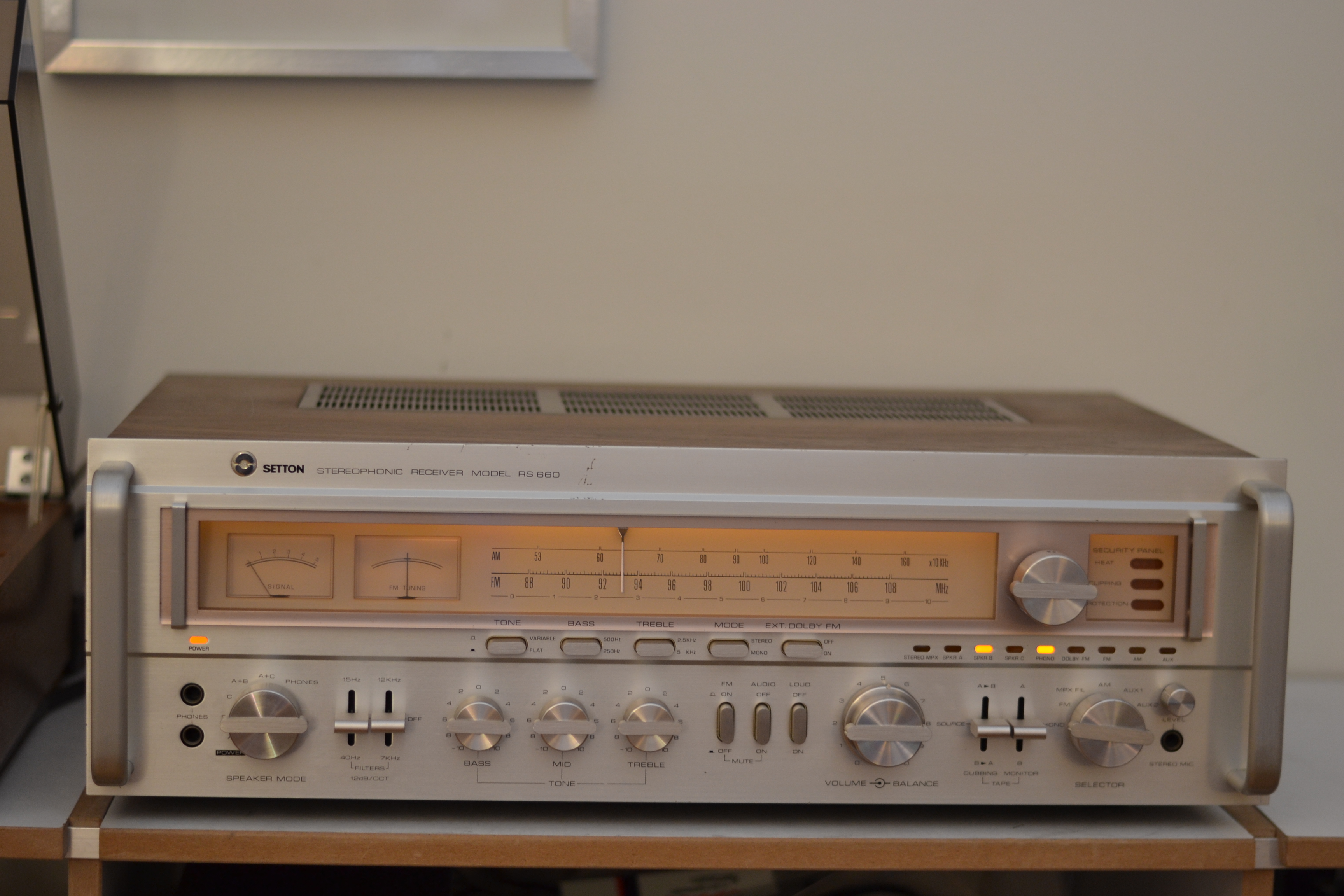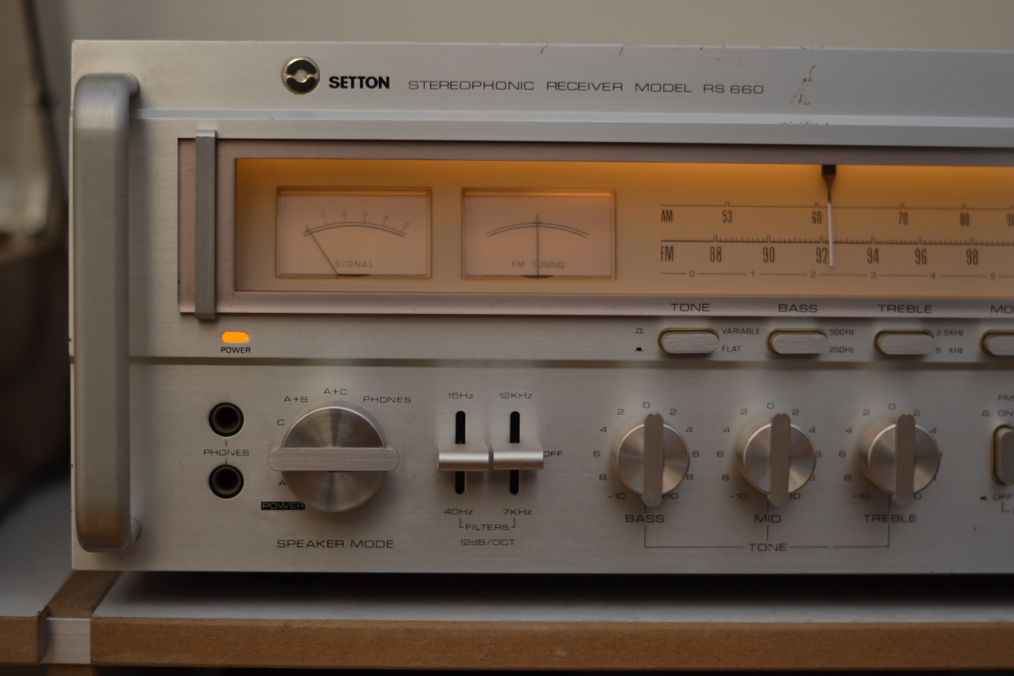 Die Front ist aus dickem Aluminum, die Knöpfe ebenfalls, das fühlt sich alles sehr, sehr gut an. Meinen erste Setton war der kleine Bruder dieses Geräts, der RS-440, auch ein schöner Receiver. Ich habe ihn in Frankreich gekauft, und nach einer Weile meldete sich der Verkäufer und fragte, ob ich Interesse am RS-660 hätte. In Deutschland ist der selten und teuer. Bei leboncoin.fr geht es. So ganz rund lief er nicht, bei Good-Old-Hifi wurde er überarbeitet und bekam ein neues Furnier – erstaunlicherweise hatte die Geräte ursprünglich nur eine Fake-Holz-Folie, was doch sehr eigenartig ist, bei dem Aufwand, der sonst getrieben wurde. Der RS-660 hat wirklich Kraft, ich muss selten lauter als 9 Uhr machen. Es ist ja auch einer der so genannten Monsterreceiver.