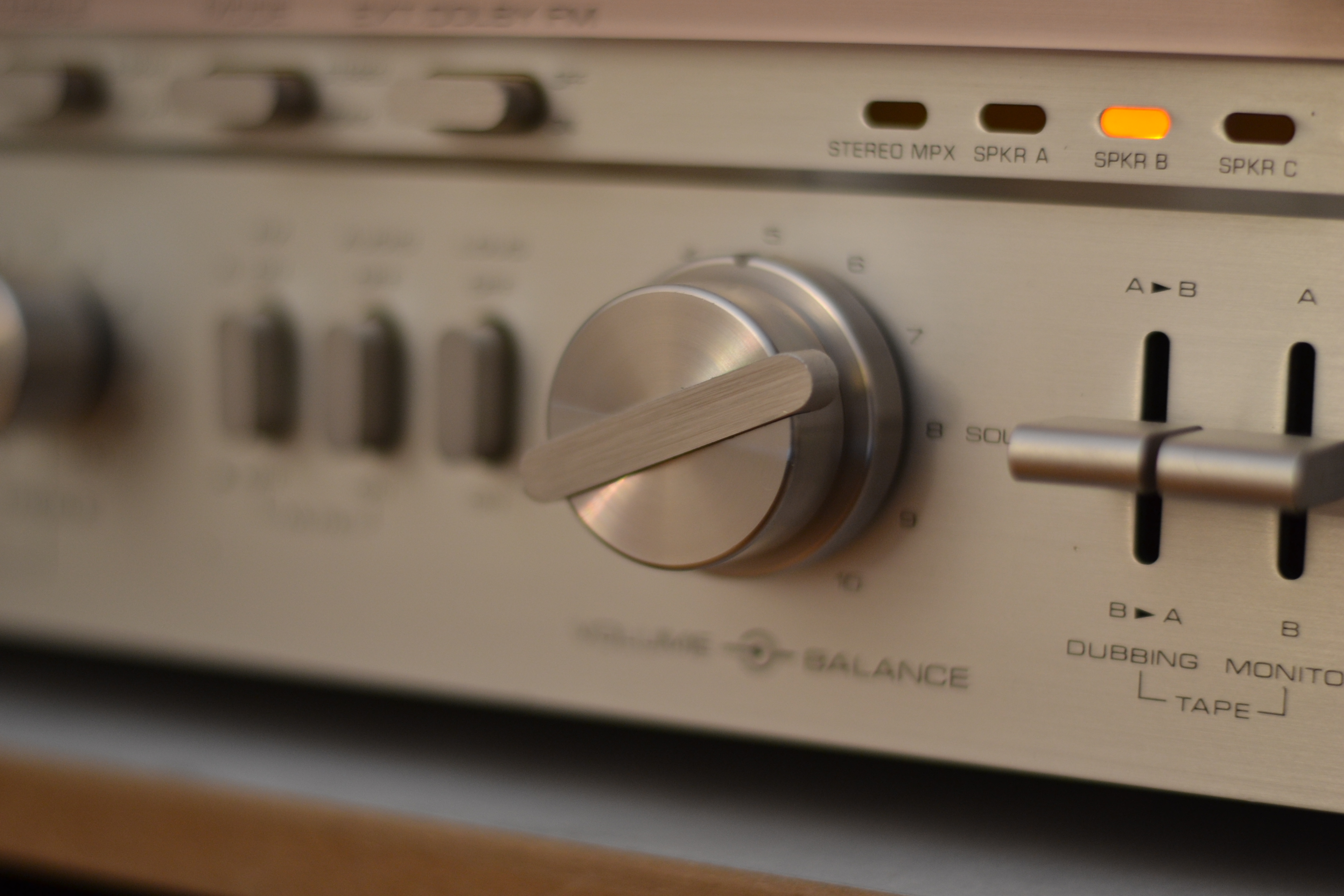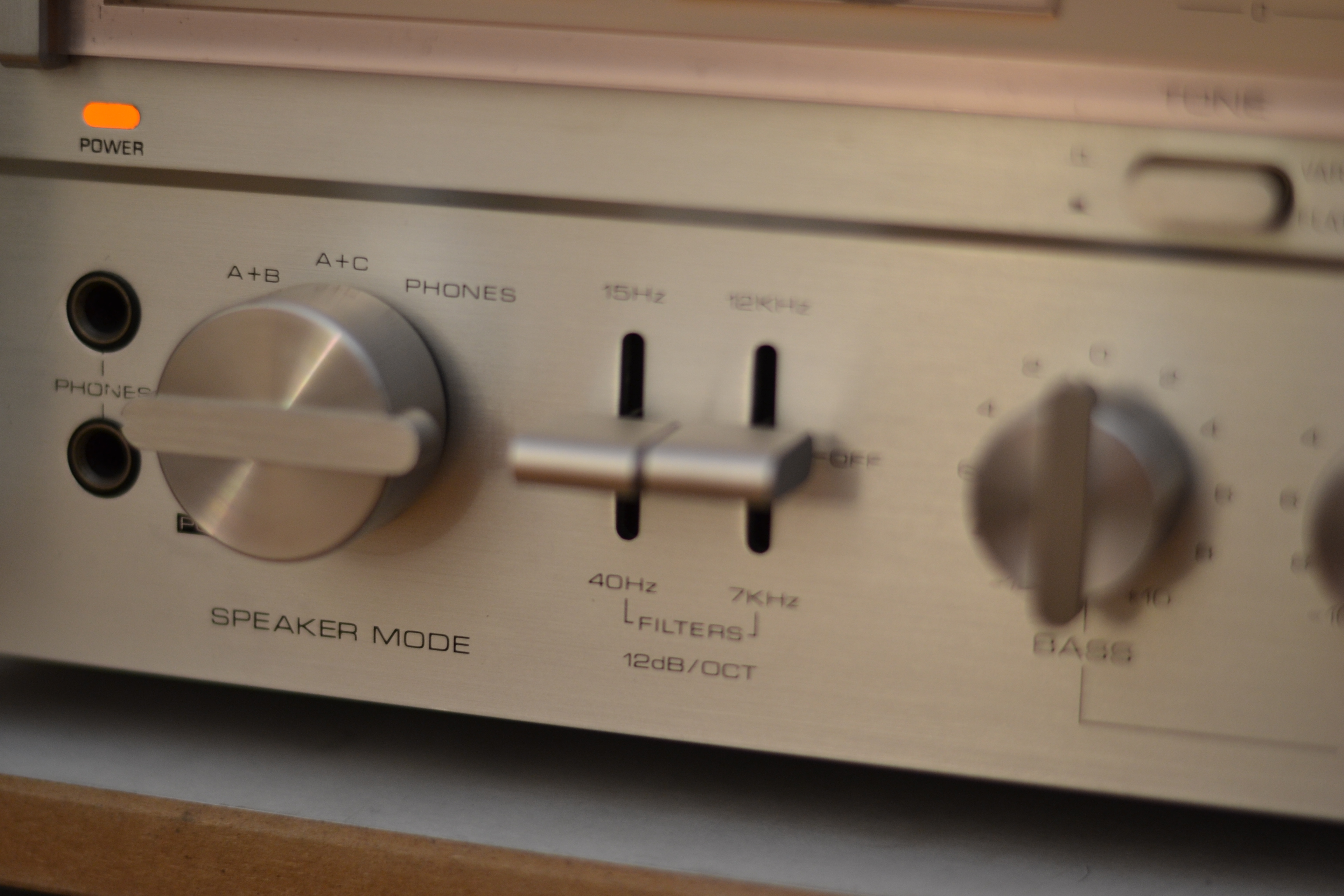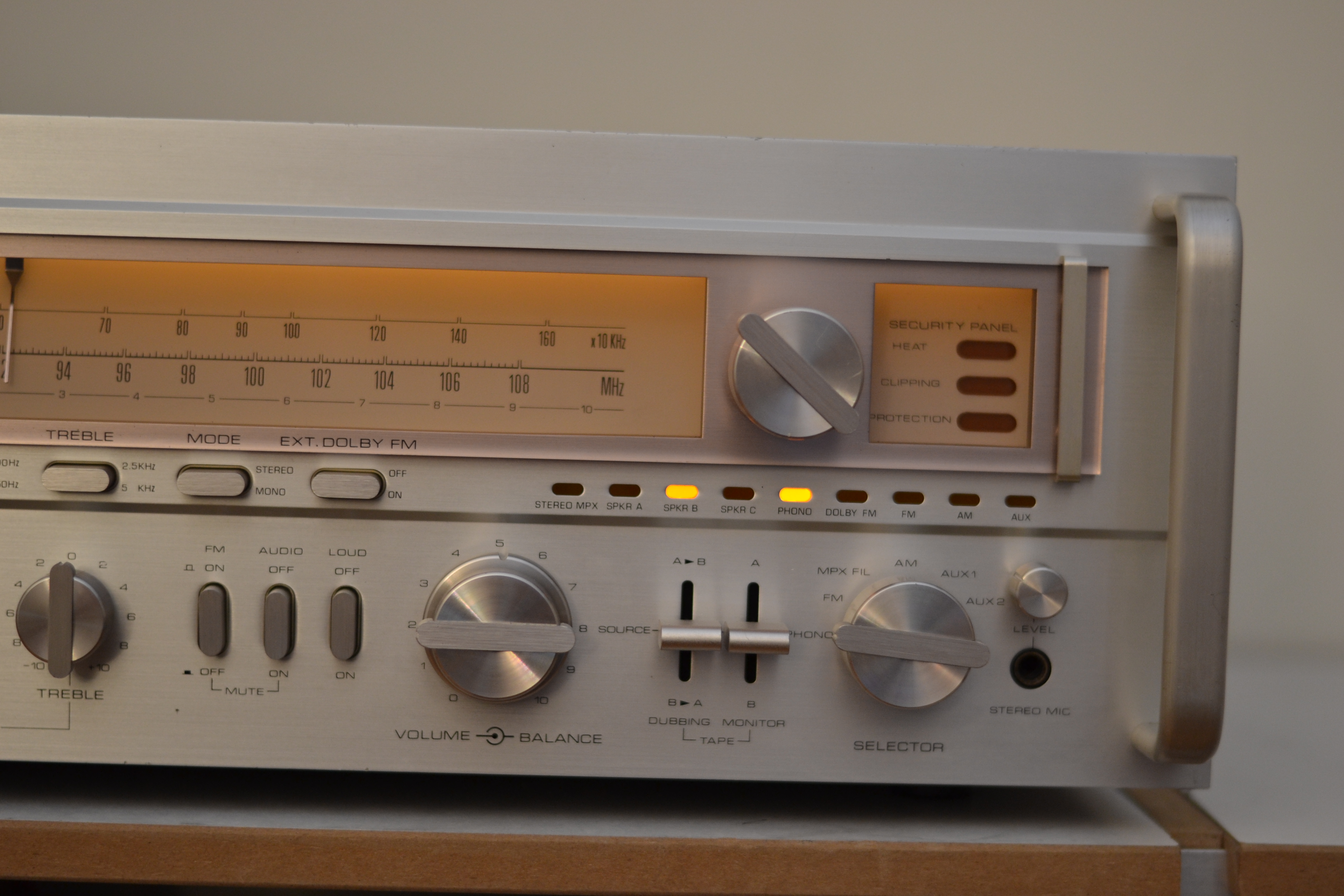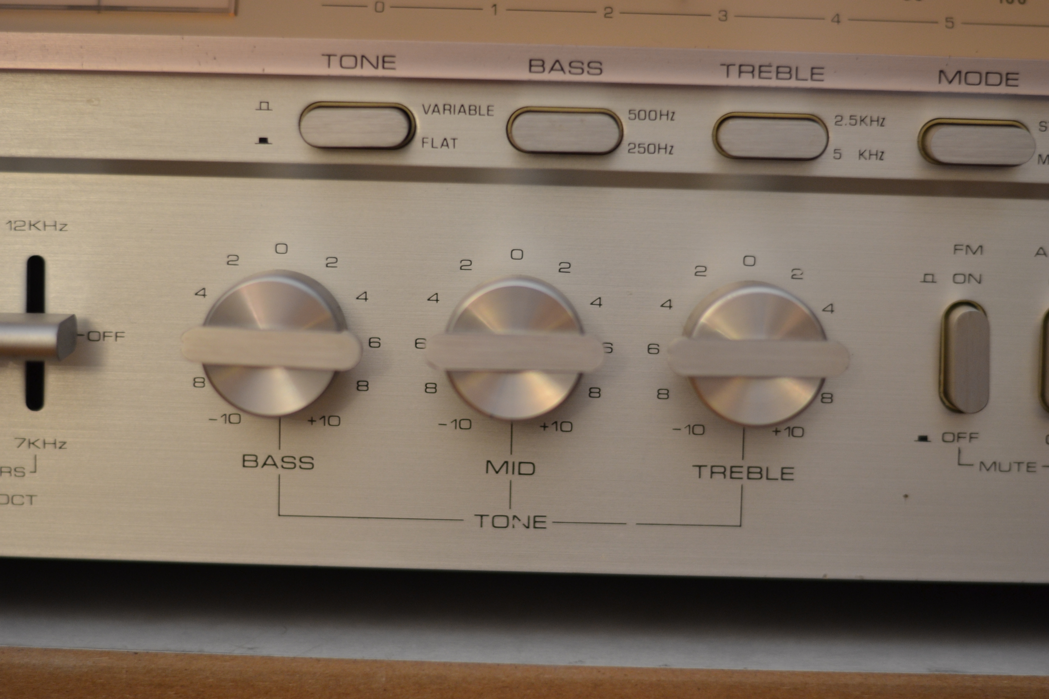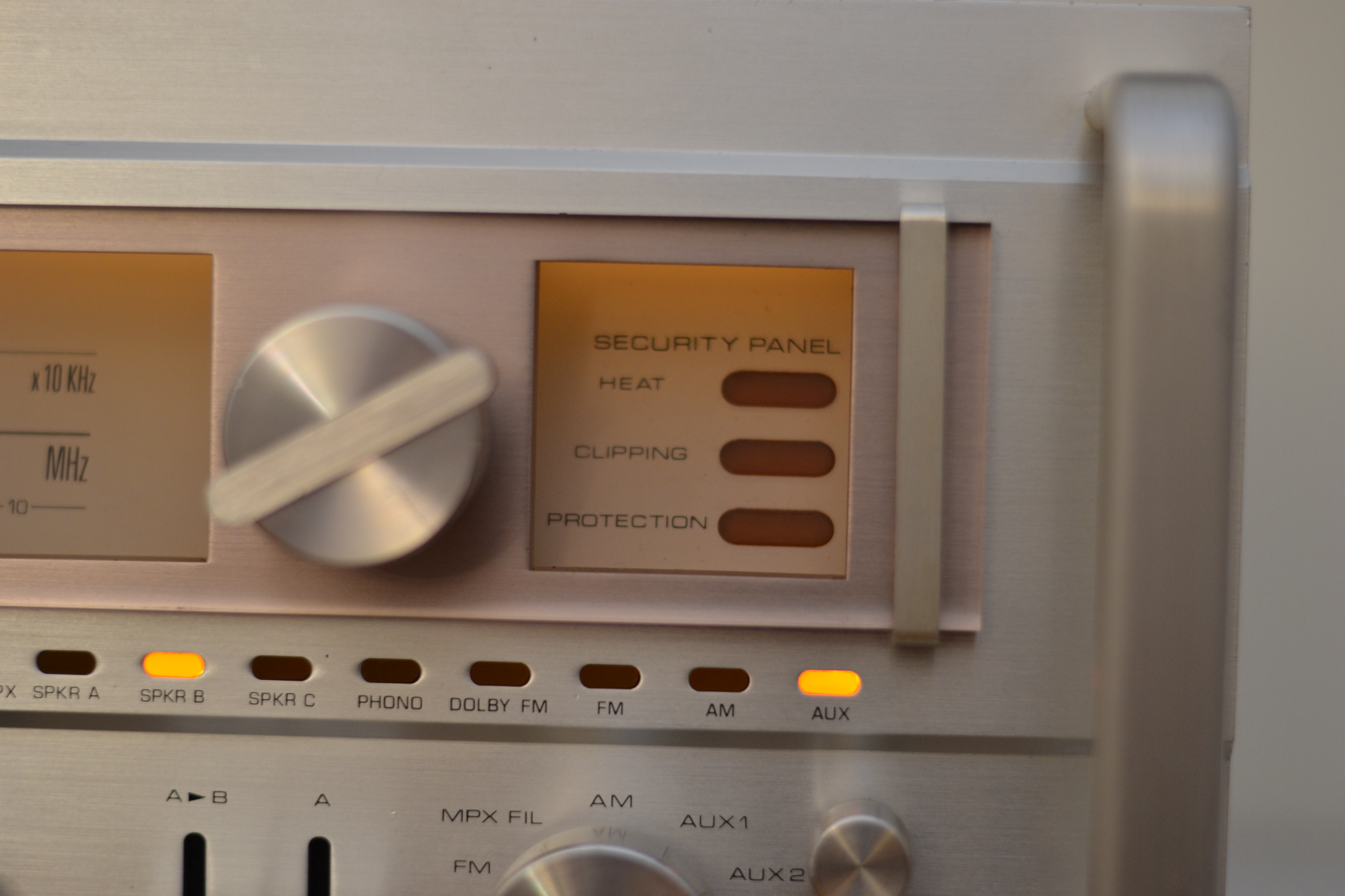 Die Front ist aus dickem Aluminum, die Knöpfe ebenfalls, das fühlt sich alles sehr, sehr gut an. Meinen erste Setton war der kleine Bruder dieses Geräts, der RS-440, auch ein schöner Receiver. Ich habe ihn in Frankreich gekauft, und nach einer Weile meldete sich der Verkäufer und fragte, ob ich Interesse am RS-660 hätte. In Deutschland ist der selten und teuer. Bei leboncoin.fr geht es. So ganz rund lief er nicht, bei Good-Old-Hifi wurde er überarbeitet und bekam ein neues Furnier – erstaunlicherweise hatte die Geräte ursprünglich nur eine Fake-Holz-Folie, was doch sehr eigenartig ist, bei dem Aufwand, der sonst getrieben wurde. Der RS-660 hat wirklich Kraft, ich muss selten lauter als 9 Uhr machen. Es ist ja auch einer der so genannten Monsterreceiver.