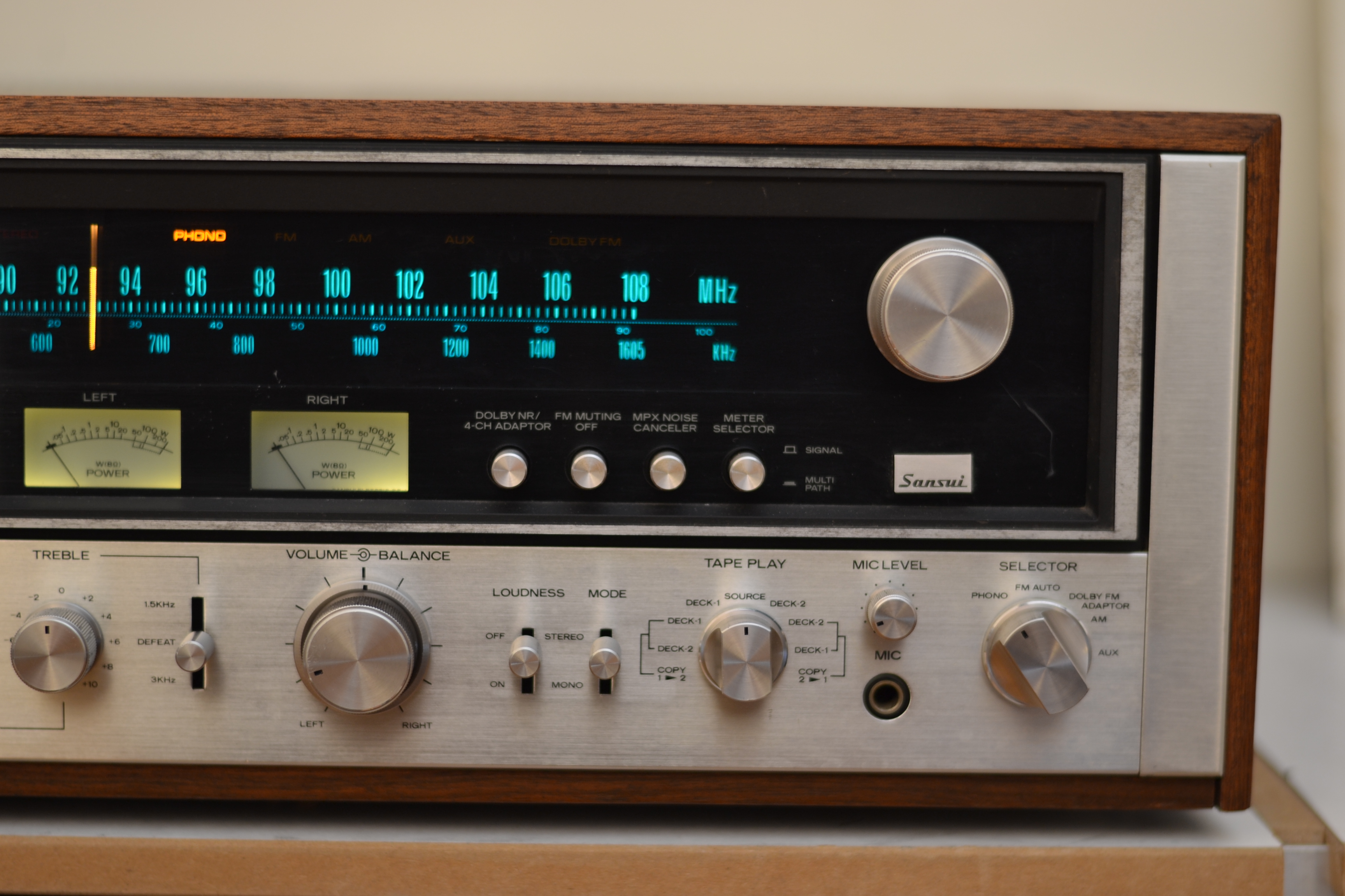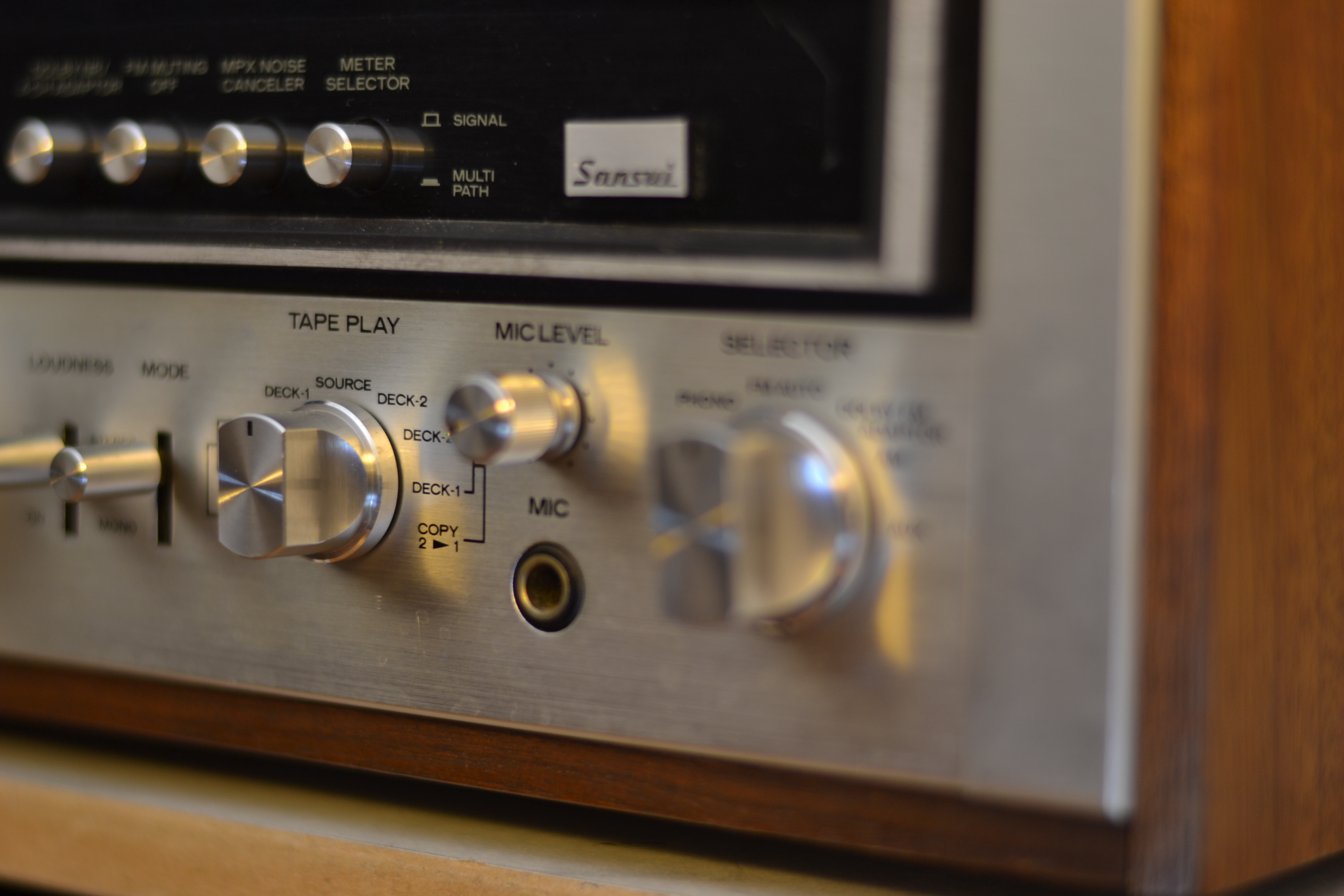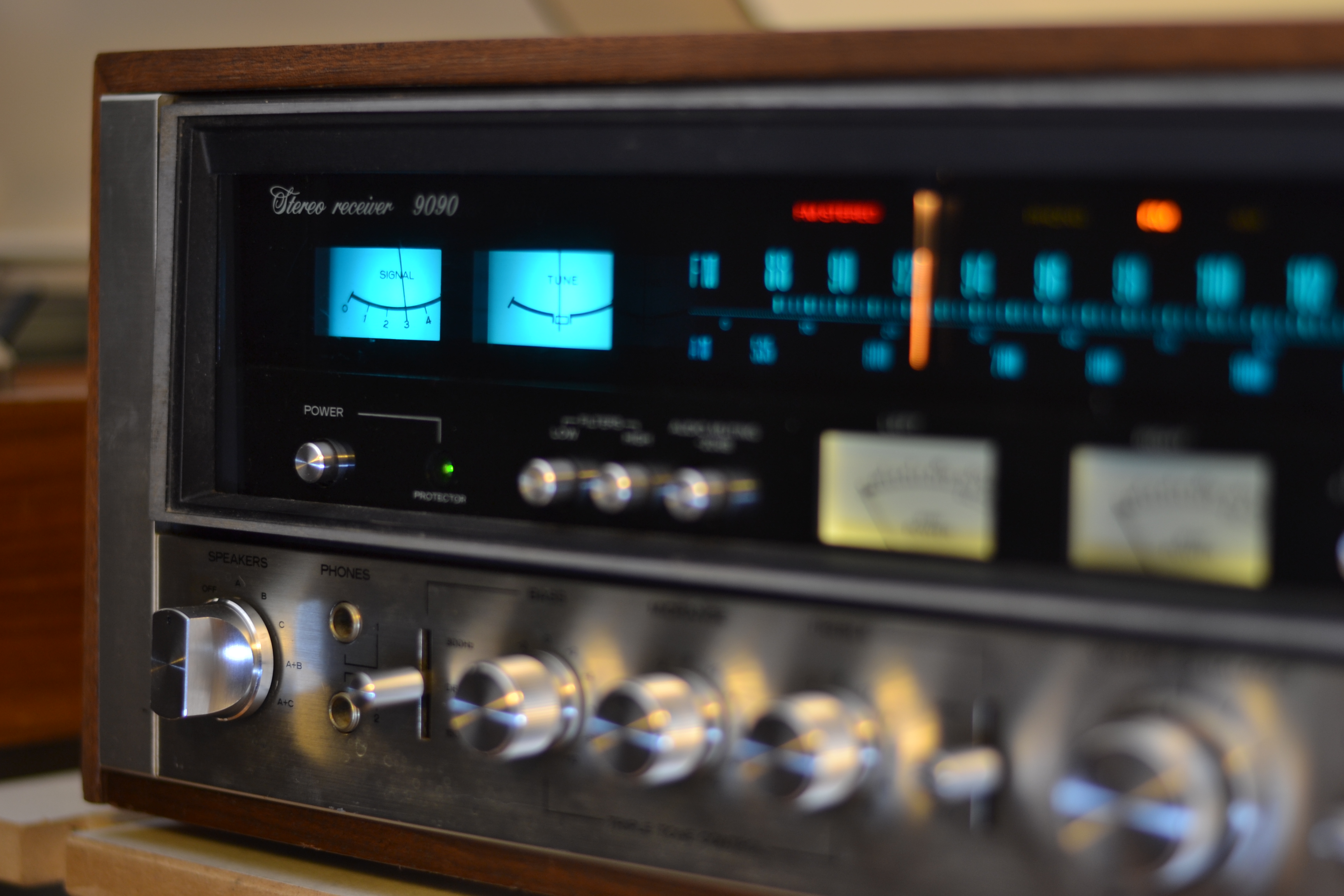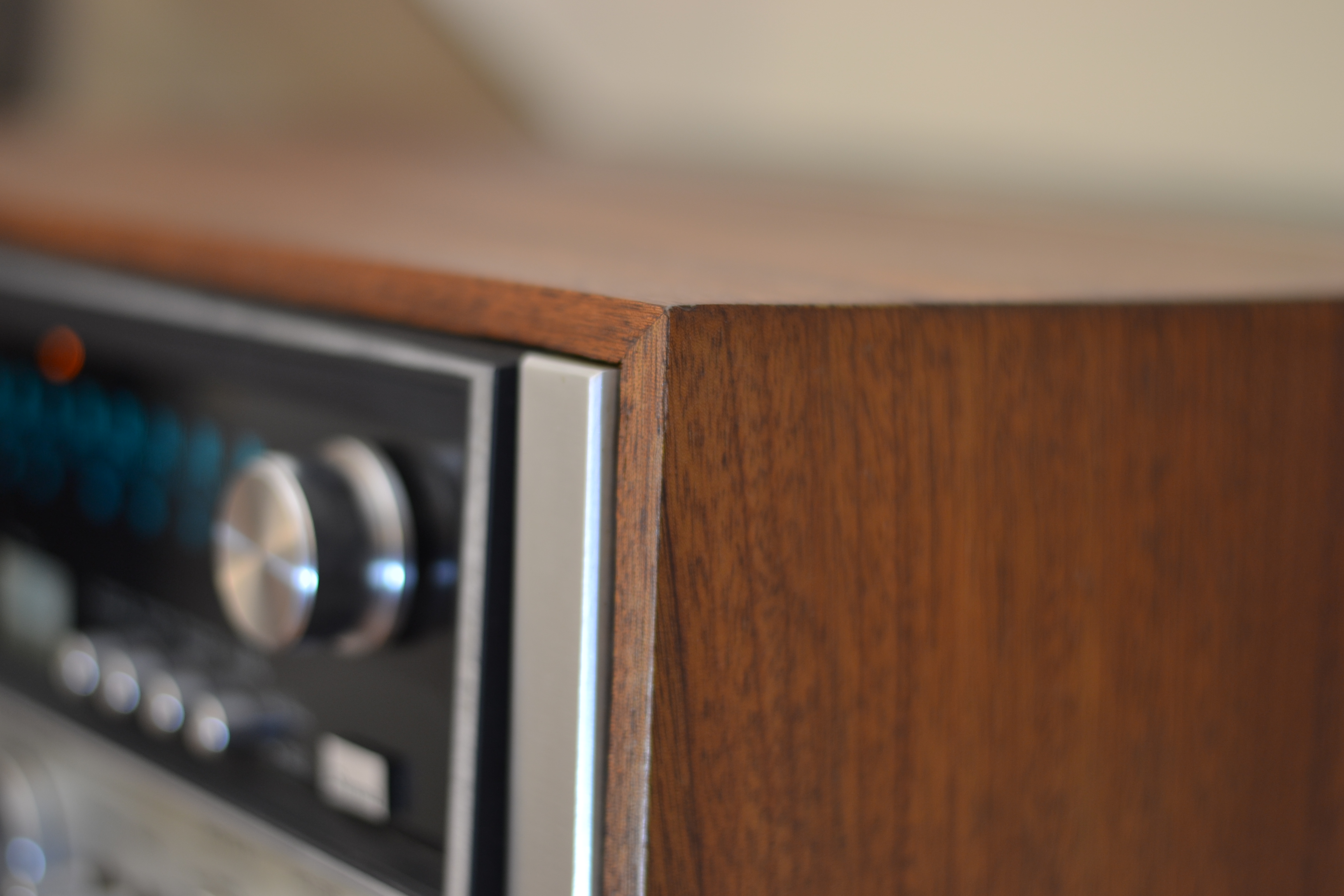 Diesen Sansui 9090 habe ich in Spandau gekauft, bei einem Mann, der sich das Gerät Mitte der Siebziger gekauft hatte, von Geld, was er von seiner Oma bekommen hatte. Er wohnte in einem dieser Hochhäuser, die am Stadtrand von Berlin stehen, von außen sehen sie umspektakulär aus, interessanterweise haben sie aber wohl ausgebaute Penthouses, in so einem wohnte dieser Mann, von oben konnte man auf riesige Wälder schauen, die Berlin offensichtlich umgeben. Er mistete alten Kram aus und brauchte den Receiver nicht mehr. Der ganz schön gelitten hatte, das sah man ihm an, kann ich mir gut vorstellen, dass da immer alle seine Freunde zu ihm nach Hause gekommen sind, weil er mit seiner Anlage am meisten Krach machen konnte. Das Gerät war ziemlich verdreckt, machte auch keinen Mucks mehr, man konnte es nicht mal anschalten. Mittlerweile war er bei Good-Old-Hifi und läuft wieder wie am ersten Tag.