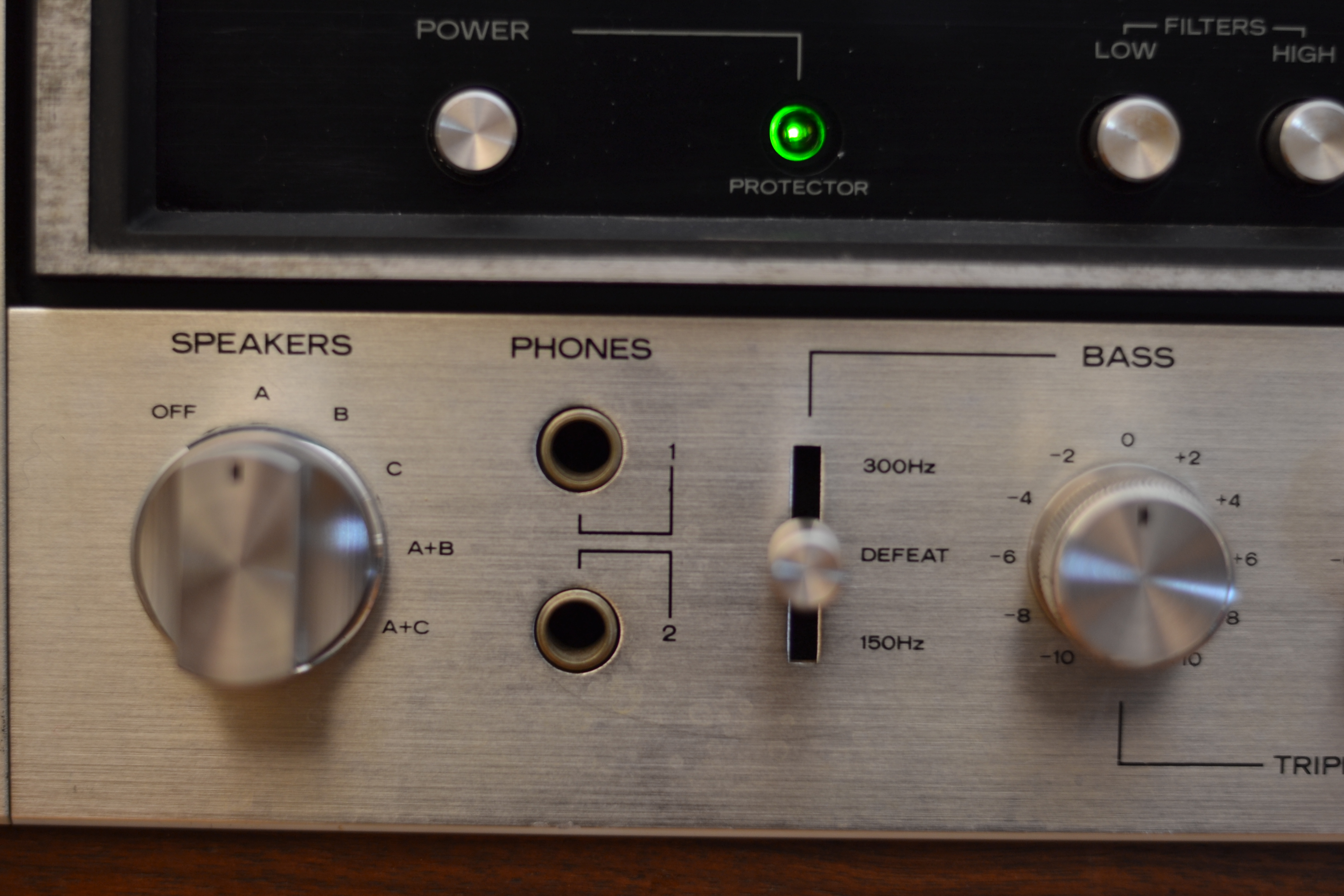 Die Ausstattung des Sansui 9090 ist ziemlich opulent. Ein sehr schöner Drehknopf zum Zuschalten der Lautsprecherpaare. Zwei Kopfhörerausgänge. Der offensichtlich in jenen Jahren obligatorische Mikrophon-Eingang, wofür auch immer der da war. Ansagen bei einer Party? Was merkwürdigerweise fehlt: ein zweiter Plattenspieler-Eingang.